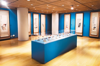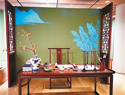 為了營造中國人讀書作畫的現(xiàn)場,展覽專門復(fù)原了一個中式書房,觀眾可拍照留念,也可在此手持毛筆畫卷,體驗(yàn)中國人的書寫方式。