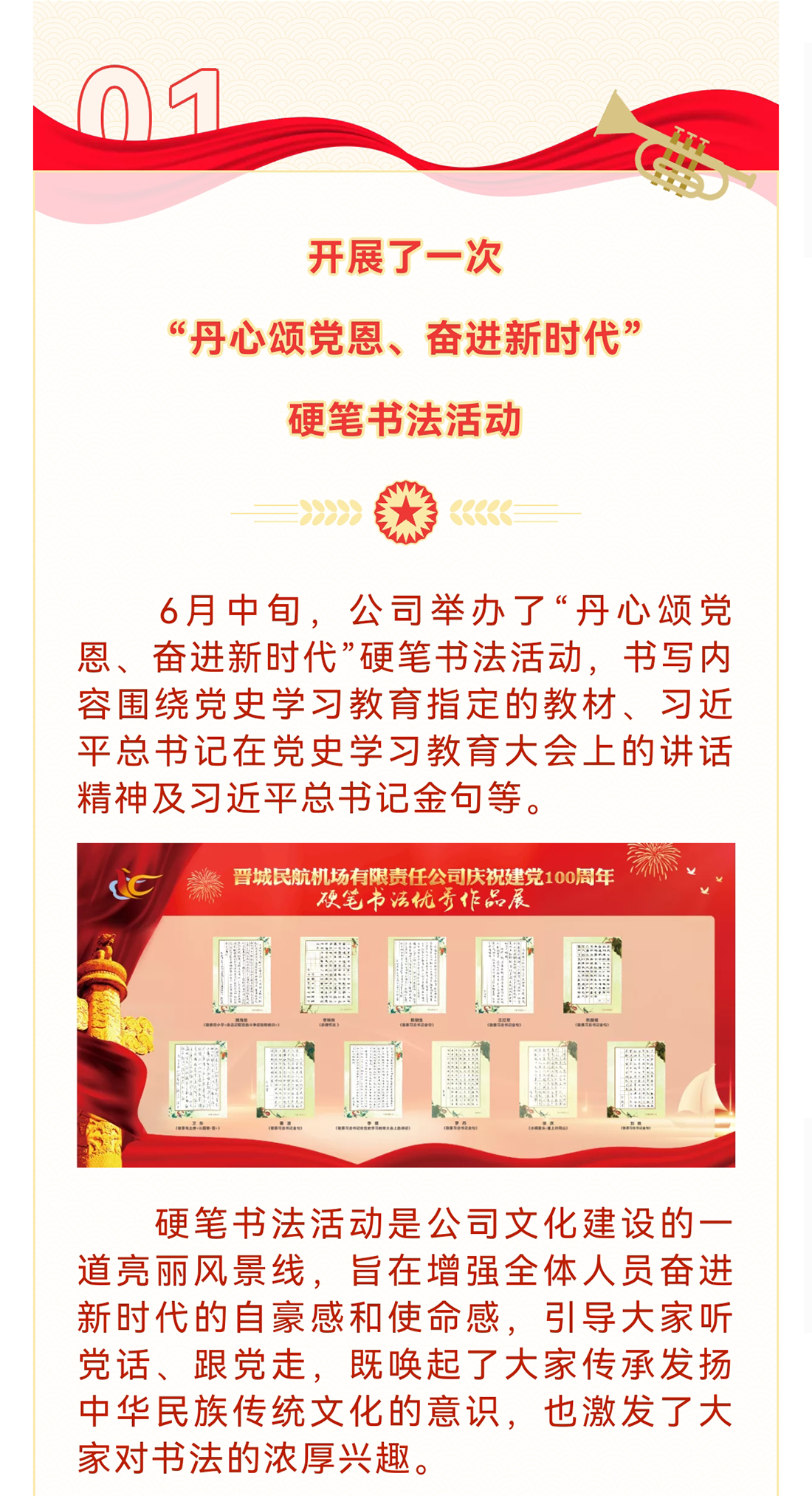 在中國共產(chǎn)黨迎來百年華誕、全黨上下深入開展黨史學(xué)習(xí)教育之際,機(jī)場公司深情回顧黨的奮斗歷史,熱情謳歌黨的光輝業(yè)績,開展系列活動慶祝中國共產(chǎn)黨成立100周年。