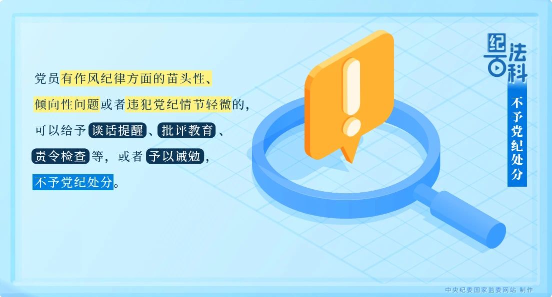 《中國共產(chǎn)黨紀律處分條例》第十九條第二款規(guī)定:黨員有作風紀律方面的苗頭性、傾向性問題或者違犯黨紀情節(jié)輕微的,可以給予談話提醒、批評教育、責令檢查等,或者予以誡勉,不予黨紀處分。