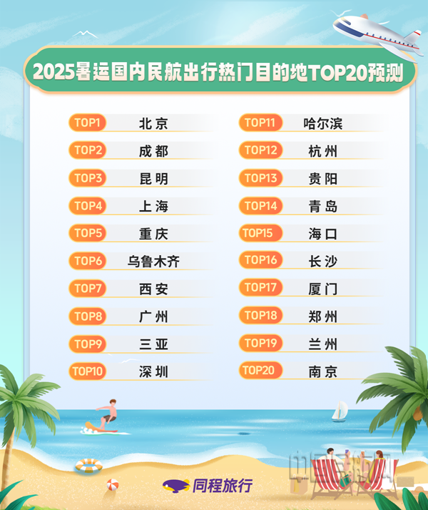 《報告》來自同程旅行平臺的暑運機票搜索數(shù)據(jù)顯示,2025年暑運國內(nèi)民航出行比較熱門的目的地主要有北京、成都、昆明、上海、重慶、烏魯木齊、西安、廣州、三亞、深圳等。其中,昆明和三亞的搜索熱度較2024年同期有明顯上升,烏魯木齊、西安等西部主要城市的熱度則相對穩(wěn)定。